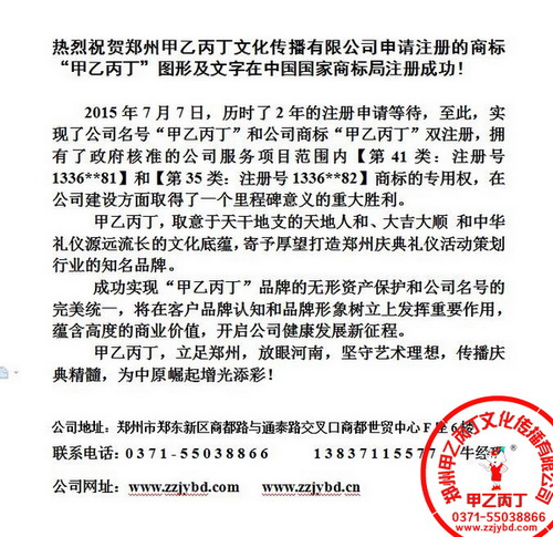 2015年7月7日!自2013年5月起,历时了2年的注册、申请、等待,至此,实现了公司名号“甲乙丙丁”和公司商标“甲乙丙丁”双注册,拥有了政府核准的公司服务项目范围内【第41类:注册号1336**81】和【第35类:注册号1336**82】商标的专用权,在公司建设方面取得了一个里程碑意义的重大胜利。